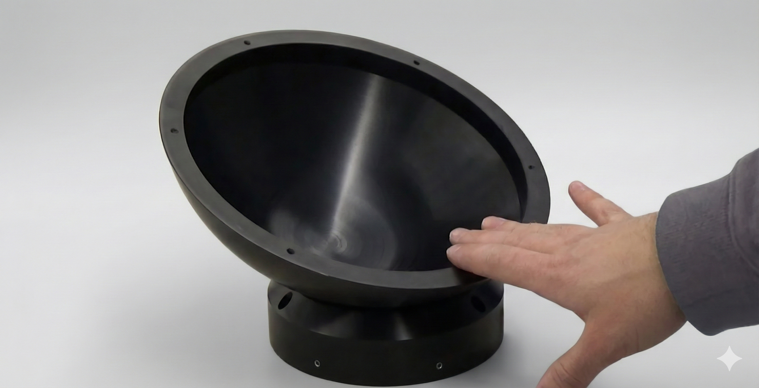 CFD (ANSYS Fluent) study of a flat-orifice, 13-inlet (1 central + 12 peripheral) spherical air bearing concept: ~279 N net load capacity at h=100 µm and ~1.2 N/µm static stiffness.